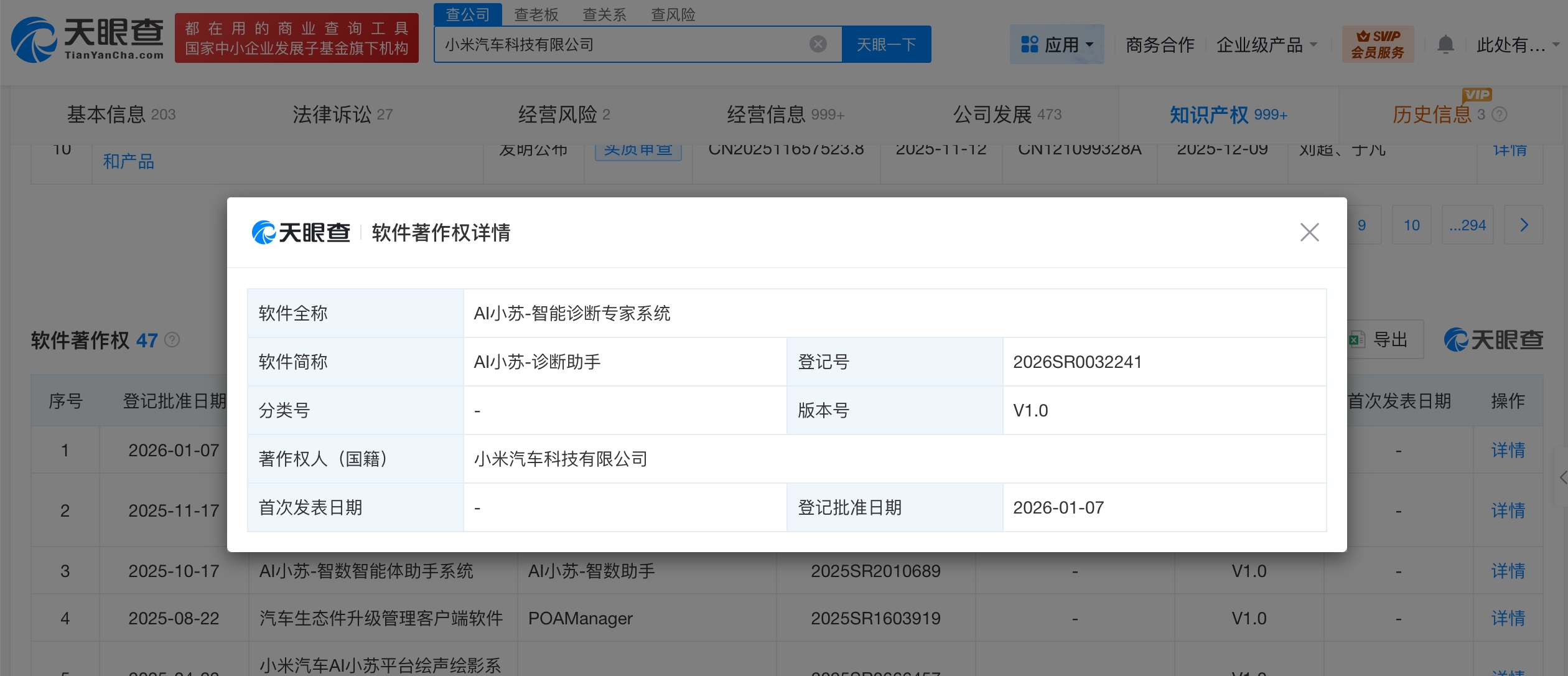 雷达财经讯,天眼查学问产权信息显现,近日,小米汽车科技有限公司获批登记“AI小苏-智能会诊民众系统”软件文章权,版块号为V1.0。