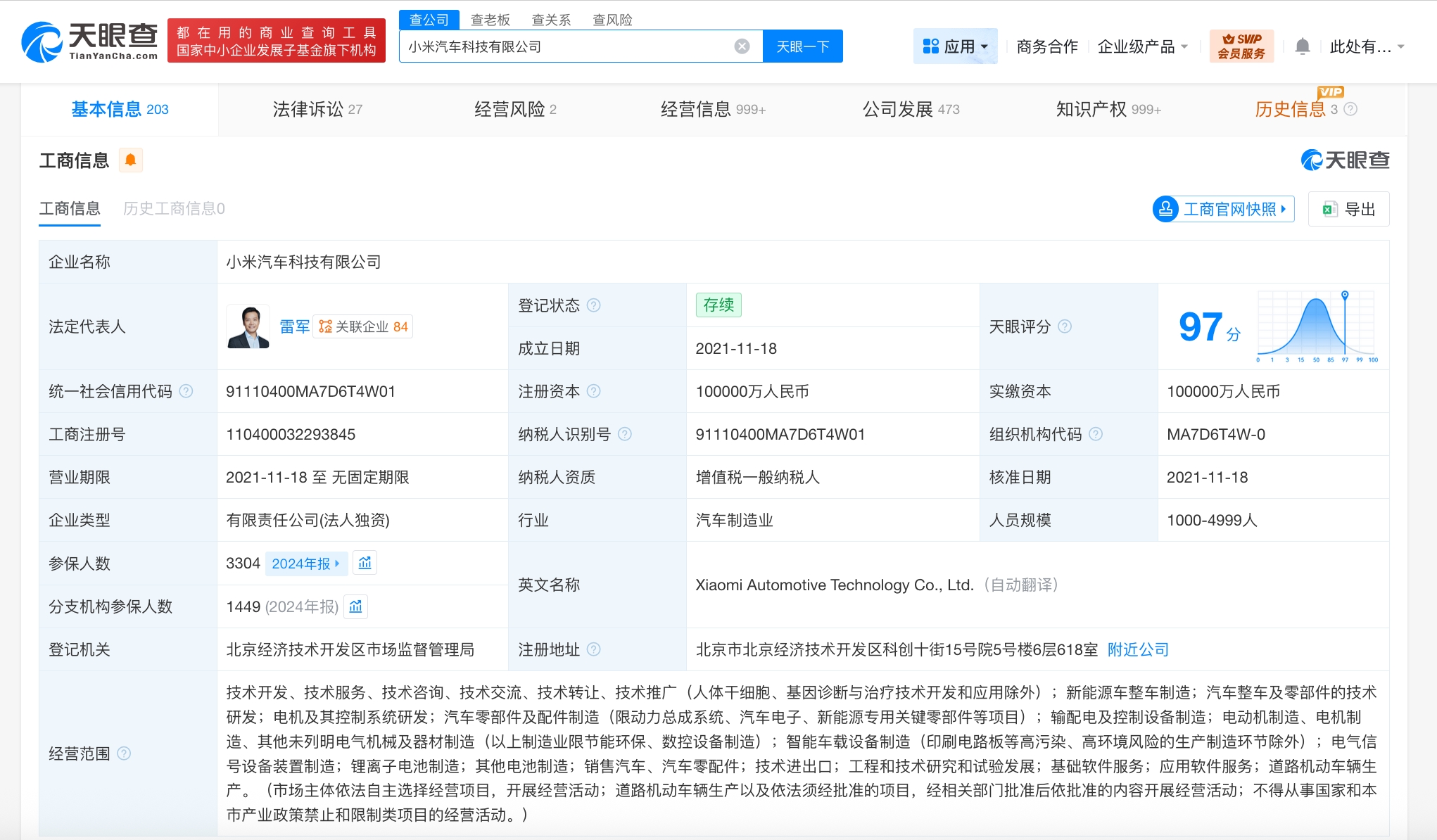 该公司确立于2021年11月,法定代表东谈主为雷军,注册老本10亿东谈主民币,筹谋规模包括新动力车整车制造、汽车整车及零部件的本领研发、电机偏激好意思满系统研发等,由小米科技有限连累公司全资抓股。