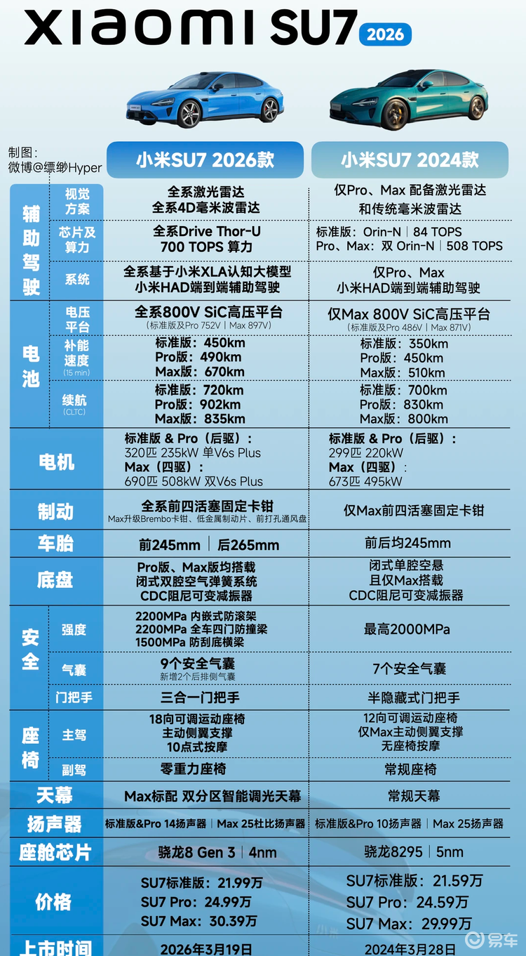 智驾方面,新一代SU7全系标配英伟达Thor芯片,算力700TOPS,调和1个激光雷达、4D毫米波雷达、11个录像头。