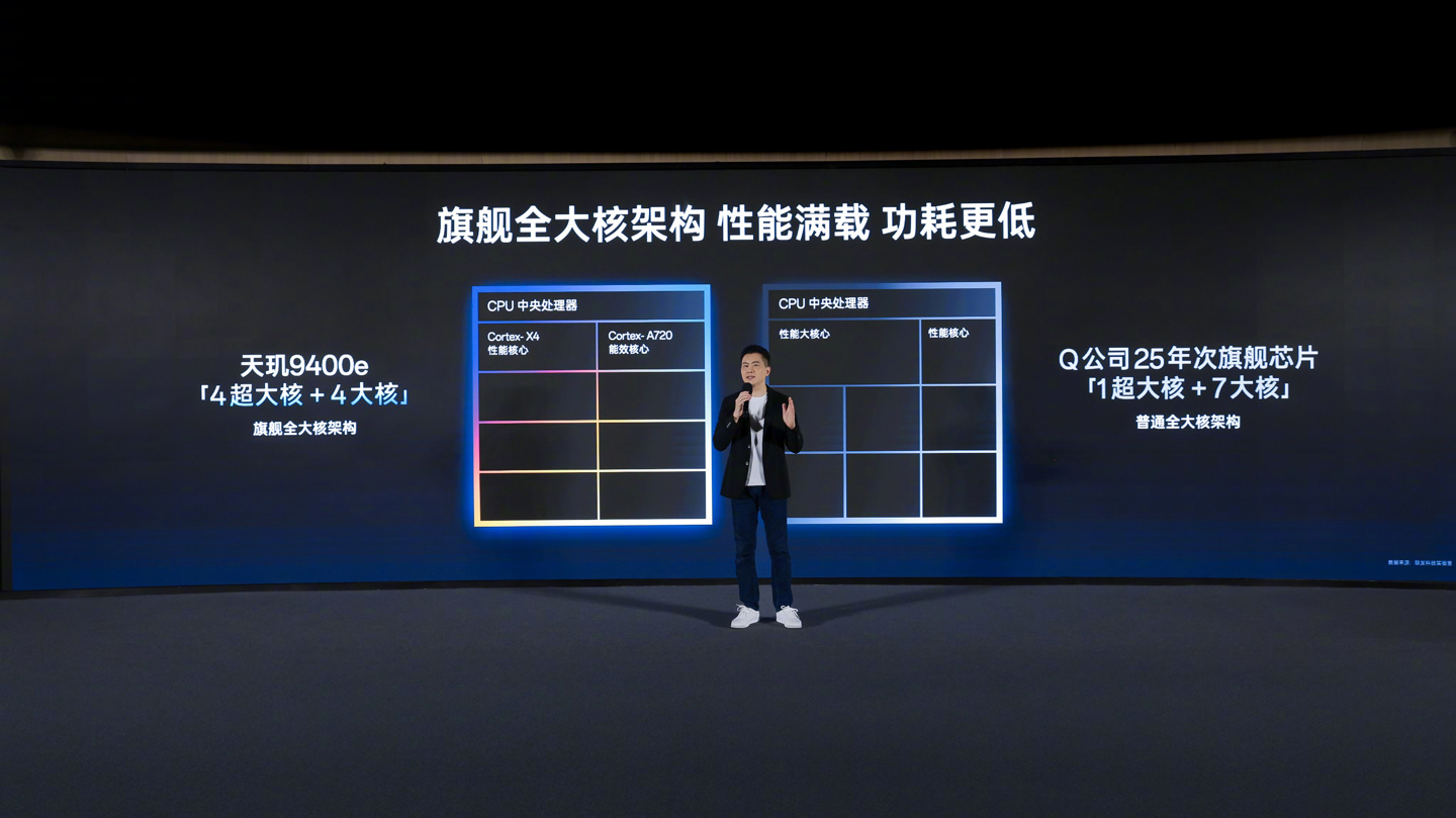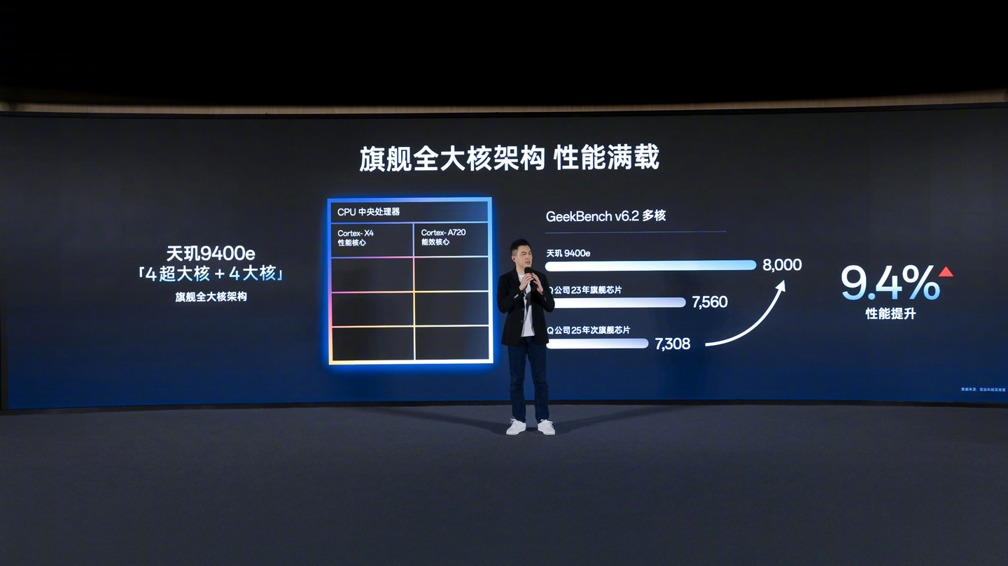 天玑 9400e 是天玑 9400 旗舰家眷新成员,CPU 秉承「四超 + 四大」 全大核想象、12 核 GPU 架构。