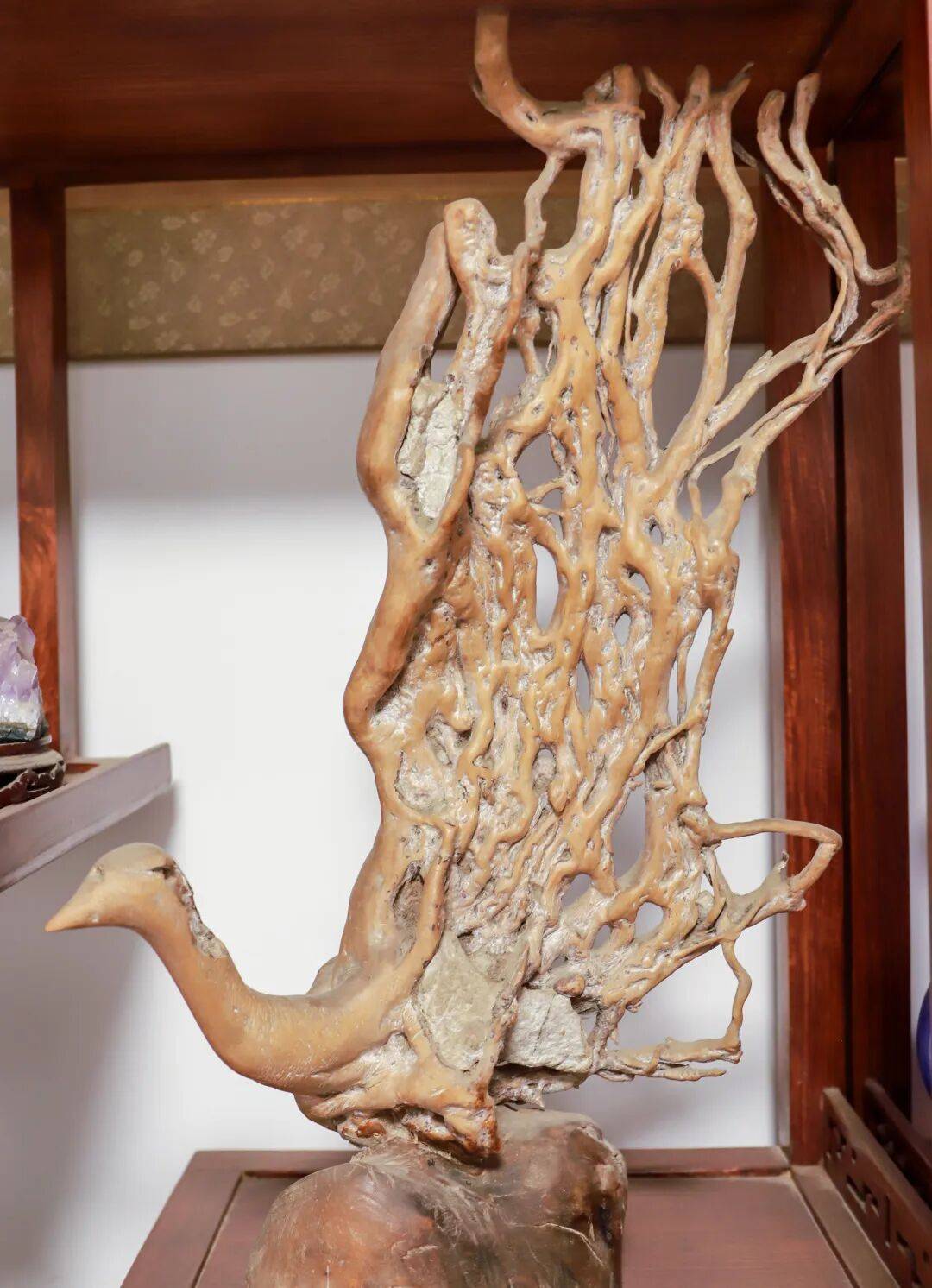 “你看这个树根,它正本被放弃在山野里,但它的形态、它的纹理,皆在向我诉说着一个故事。” 在姜淳厚家中,那些看似平平无奇的枯木,经他巧手砥砺,便化作了《子母情》《凤凰》《孔雀》等艺术珍品。这就是根艺,一门化衰弱为神奇的艺术。
