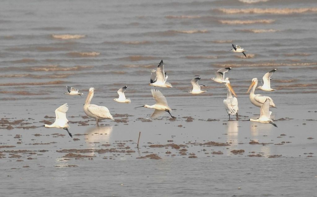 崇明东滩的候鸟,其中可见卷羽鹈鹕。唐国良 摄
